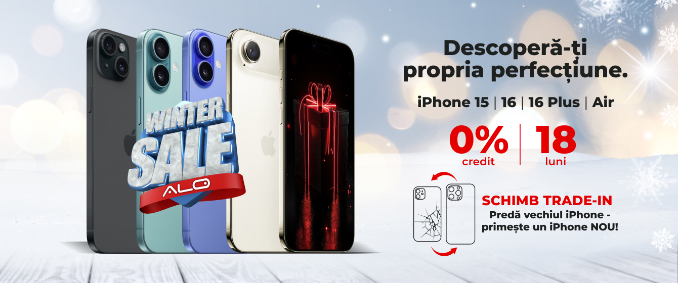 Te gândești la un iPhone nou și îți dorești mai mult în această iarnă ✨📱 Dacă apreciezi stilul, tehnologia și funcționarea impecabilă în fiecare zi, iPhone 15, 16, 16 Plus și Air îți deschid propria versiune a perfecțiunii. Ecranul luminos, performanța puternică și senzația premium în fiecare detaliu îl transformă în alegerea ideală pentru viață, muncă și plăcere 👌 Doar acum, în cadrul Winter Sale ❄️💥, este disponibil credit 0% pe 18 luni 💸, precum și un Trade-in convenabil: predă iPhone-ul vechi și obține un iPhone nou fără costuri suplimentare 🔄🎁 Simte cu adevărat schimbarea și fă pasul către tehnologiile viitorului alături de ALO.