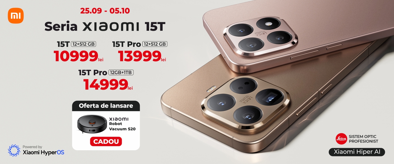 🎁 Iar acum, la lansare, primești cadou un Xiaomi Robot Vacuum S20 — ca să ai mai mult timp pentru ce contează cu adevărat. 🔥 Alege Xiaomi 15T sau 15T Pro și intră în noua eră a inovației mobile!